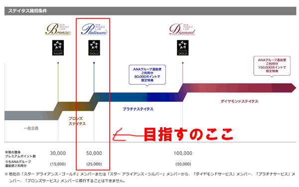 プラチナステイタスのためには、1月~12月で合計50000プレミアムポイントが必要です。