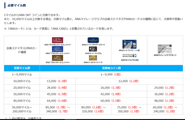JALの場合は、一律1万マイルが15000円分として利用できるのですが、ANAの場合は、同じようなANA SKYコインというものに変更できるのですが、条件が色々違うようでして、マイル数によって換算率が変わってくるようです。