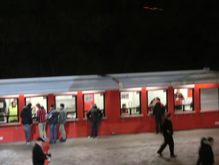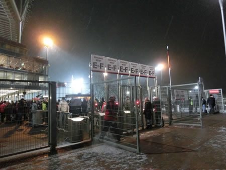 | 2013年2月14日に、UEFAヨーロッパリーグ2012-2013シーズンのバイヤー・レヴァークーゼンvsベンフィカの試合を観戦しました。チケットは、日本にいる際にレヴァークーゼンのオフィシャルサイトから購入。スムーズに購入できたのですが、郵送となっていたので、ほんとうに届くのかと心配していましたが、出国の2日ほど前に届きました。これに関しては、もし届かなくても、購入情報などをプリントアウトして持っていけば、現地で対応はしてくれるようです。ただ、手続きの時間など気にしなくてはいけないので、早めに見たい試合が決まっている場合は、出国までの期間に余裕を持って申し込む方が良いと思います。19時キックオフの試合で、ケルン中央駅からS6で20分程度の所要の場所、Sバーンは20分おきくらい、その間にREが30分に1本ほど走っているので、それほどアクセスに不自由しない場所ということで、スタジアム巡りをしつつ、試合の30分前くらいを目安に移動する予定で動いていました。この日は、あいにく夕方から雪という予報で、更にスタジアム巡りの乗り継ぎも思ったように行かず、本当はもう一つ行こうと思っていたスタジアム訪問をあきらめて移動し、少し余裕を持って移動したものの、雪のためのダイヤの乱れから途中で電車が10分くらい動かなくなり(その間に、所掌さんの検札が行われて、カップルが罰金食らってましたw)、結果的にスタジアム到着が予定通りの試合30分ほど前ということになりました。