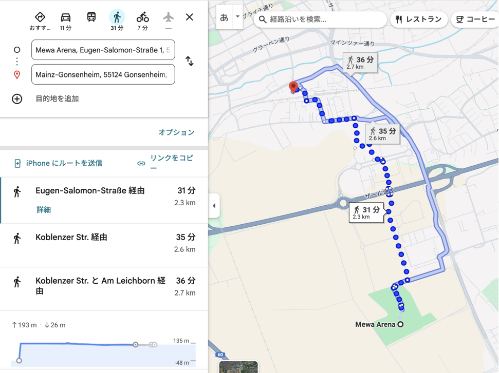 マインツ・ゴンゼンハイム駅からは2.5キロほどで徒歩30分くらい