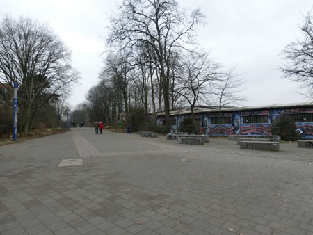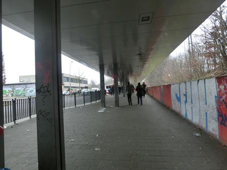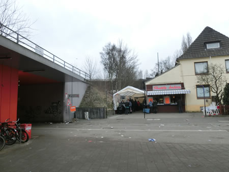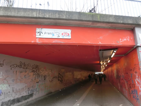 ■方向通りに進むと、レストランかバーらしき店の外で酒を飲むハンブルガーSVファンを眺めつつ、左に線路の下をくぐるトンネルがあります。