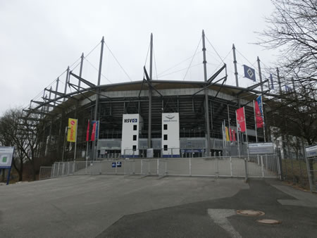 2013年2月17日に、スタジアムを訪問しました。ドイツの旅の最終日。翌日ハンブルク空港から帰国するということで、最後に1日は、フレンスブルクからハンブルクに移動し、午後の時間を使ってハンブルクのスタジアムを回りました。最初に訪れたのが、ハンブルガーSVのホームスタジアムのイムテック・アレーナになります。滞在したのがハンブルク中央駅最寄りのホテルでそこからスタートしたのですが、どうもこの時点でもドイツの地下鉄には慣れません。S3で行くはずなのですが、最寄駅方面に行きそうな電車が分からず、とりあえずS1に乗ってアルトナという駅まで行き、そこからS3のピンネブルク行きに乗って最寄駅のシュテリンゲン駅に到着。駅の出口が一つで、ホームの階段を下りるところからスタジアムのマークの表示があるので、これをたどって行けば全く問題なくスタジアムには着けます。出口から線路の下をくぐって反対側に抜けたところにバス停もあります。ちょうどこの日は、試合はなかったもののイベントなどがあったのか、ハンブルガーSVのマフラーを付けたファンらしき人たちが多くスタジアム方面い向かっており、シャトルバスも走っていました・・・が、初めて来たスタジアムは一人で来た時にはとりあえず歩いて感覚を掴んでみようという方針なので、徒歩でスタジアムを目指しました。