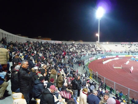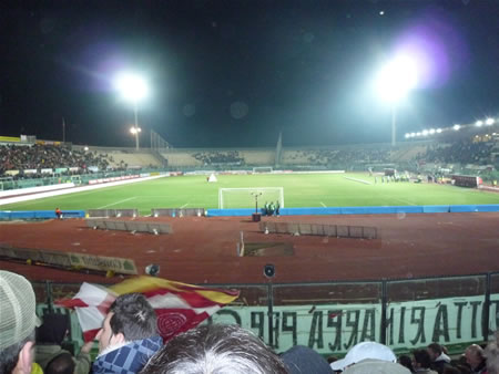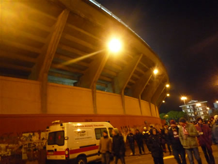 | スタジアムまでの道のり | 駅からNO.1のバスに乗ります。バスは↑へ走り広場を抜け海まで行くと←へと曲がり真っ直ぐ進みます。 しばらく進むとViale Italiaという通りになるのでその通りにあるSan Leopoldoというバス停で降りるとスタジアムが少し奥に見えます。 |