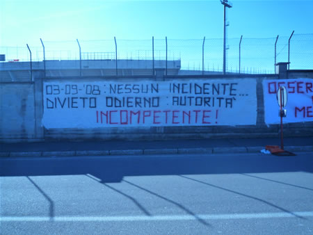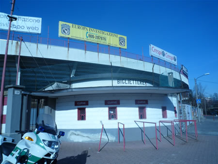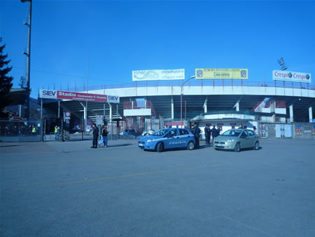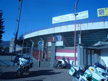 | 単刀直入に言うとヴァレーゼ市民以外入場禁止の日に行ってしまったようです。シーチケなど主流のイタリアで試合当日の試合直前にも係わらず当日券売り場に人だかりができていて怪しげな雰囲気はあったのですが、とりあえず当日券売り場が空いていたので並んで順番を待ちました。30分以上待たされてやっと周ってきたと思ったら、当日券売り場のスタッフが困った顔をして入り口の警察のところに行くように言われてしまい、そこへ行きパスポートを見せたら「入場できない!」と一蹴されてしまう。