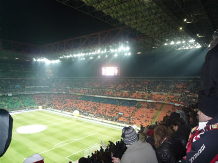 ACミラン、インテル共に独自のインターネットチケット販売のシステムを持っているので日本人観光客にも比較的事前に自分で調べて手配してということができるミラノの人気チームですが、今回のミラノダービーのようなチケは一般販売はほぼないと考えた方がいいようです。イタリア国内でもノパソ持参でホテルのLAN環境を利用して毎日チケットの状況をチェックしていたものの、最後まで一般販売には辿り着きませんでした。ただ、もしかするとACミランホームでのミラノダービーの場合には(ミランポイントのチケット販売サイト)から申し込めばクルヴァは無理だとしてもどこかしらの席は確保できたかもしれません。スタジアムの規模自体は非常に大きいので例えばUEFAカップのACミランvsヴェルダー・ブレーメン戦などは試しに試合の3日前ほどにそのサイトでクルヴァ席を申し込んでみたらクルヴァはないものの他の席種ならあるという返答がありました(平日の試合でチャンピオンズリーグでもないからかもですが)。インテルホームのミラノダービーでしたが、ACミラン側のクルヴァでブクメは観戦しました。どちらのファンでもないブクメですがレベルが高いチーム同士の対戦と言う事でクルヴァの雰囲気を体感することが目的の旅でしたが同行者をクルヴァの中心に1人で送り込んで自分は一番上の席で立って試合を見ていました。感想は試合内容つまらなすぎという不完全燃焼で、これなら他の試合同様試合見られなくてもいいから危険なエリアに入り込めば良かったかと・・・。