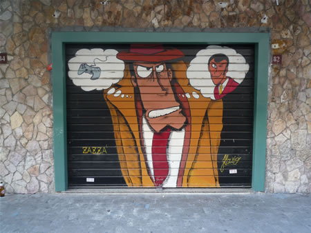 ■スタジアム周辺の店のシャッターに描かれた銭形警部とルパン