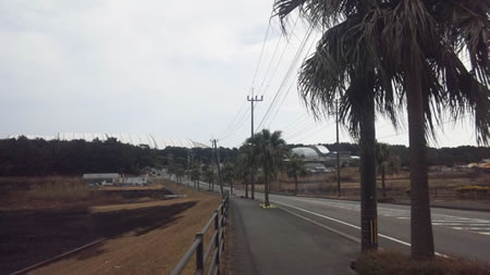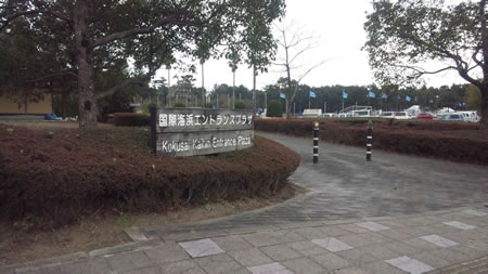 国際海浜エントランスプラザの看板が出てきました。左手に行ってしまうとグラウンドからは離れてしまうので注意しましょう。右側にフローランテ宮崎の建物が見えます。そちら方面が正解です。