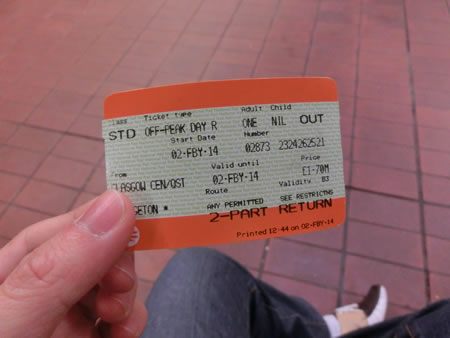 ■グラスゴー中央駅からブリッジトンまでの切符。往復で買う方が断然お得なことを知る。でも、結局、今回も帰りは歩いてしまったのですが・・・。