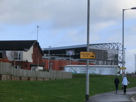 ■駅を出ると目の前にセルティック・パークの方向が示してありますが、駅を出て右にずっと進めばスタジアムに到着するので、特に迷うことはないでしょう。