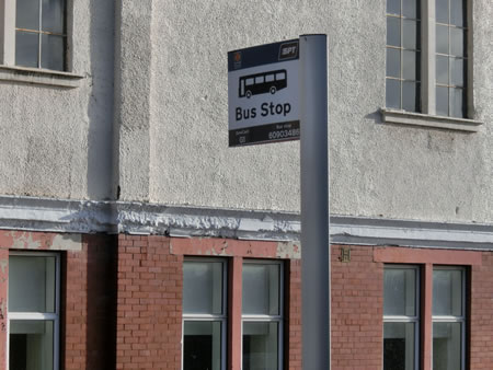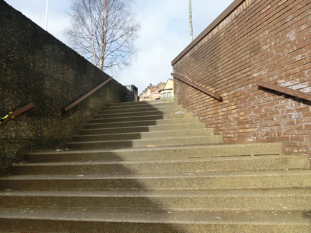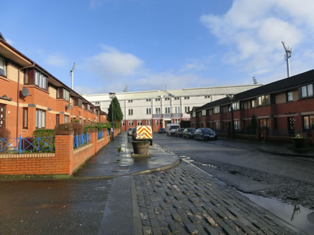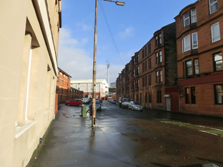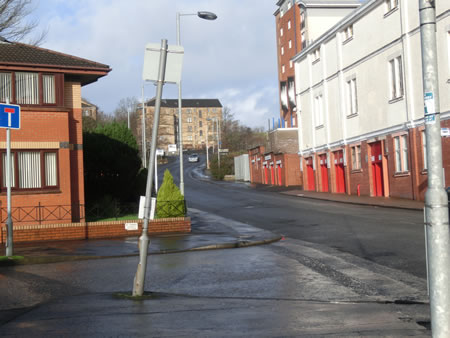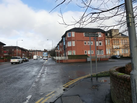 ■15分ほど歩くと、Maryhill Roadが左にカーブしているところでGarcube Roadとの交差点があります。この写真で見えているレトロな建物の、奥の方にスタジアムがあります。