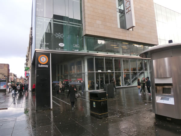 ■グラスゴー中央駅から、一番近い地下鉄の駅は、セント・エノック(St.Enoch)になります。中央駅からつながっておらず、いったん出て数分歩いて地下鉄駅に入る形になります。アーガイル・ストリート(Argyle Street)少し歩くとSubwayの表示が出てきます。