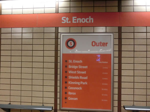 ■セント・エノック駅からの場合、外回り(Outer)に乗り、アイブロックス駅(Ibrox)まで6駅でになります。