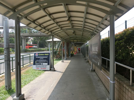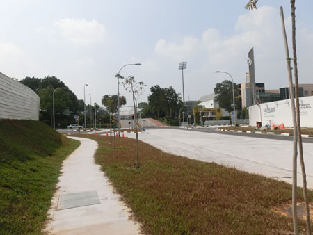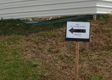 ■最初に説明した手順でも簡単にスタジアムにたどり着けるのですが、もう少しショートカットした駅までの道と周辺を開発中のようです。施設に入る交差点を反対側に渡ったところに、手作り感満載の案内板が立ててあります。そこには、MRT/Bus Interchangeはこっちですよ、とあります。要するにこの方向から駅とバスバス乗り場に行けるということですね。