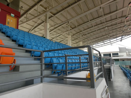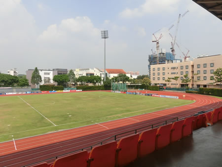 | 2013年6月にスタジアムを訪問しました。ひとつ前のトア・パヨー・スタジアムの最寄駅となるトア・パヨー駅から2つ先のビシャン駅最寄りとなるのが、ホーム・ユナイテッドのホームスタジアムとなる、ビシャン・スタジアムになります。 距離で言えば、トア・パヨー・スタジアムからは4キロ程度の距離になります。 気合いで歩くとか、レンタサイクルがとか、そういうのもありなのですが、基本的に暑い国では、日本で言えば歩ける距離だな~という感覚が、絶望的にきついことも多々あります。逆に言えば、暑いことや、土砂降りの雨が降ることが普通と言う国なので、駅周辺がモールになっていたり、雨を防げるような屋根の下をしばらく歩いて行けるようなところがあるので、そういう場所であればある程度の距離なら歩いてしまうという手もありますが、初めての場合は、やはりできるだけ近いところまで公共交通機関で行くのがベターです。 ビシャン・スタジアムも、スポーツ複合施設の中にあるスタジアムで、ここも施設のメインはスタジアムよりも水泳用施設と言えるかもしれません。1998年に作られたスタジアムで、スタンドもグラウンドもきれいでした。でも収容は最大で4000くらいなんですよね。 ゴール裏に座席はありません。 | |