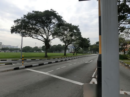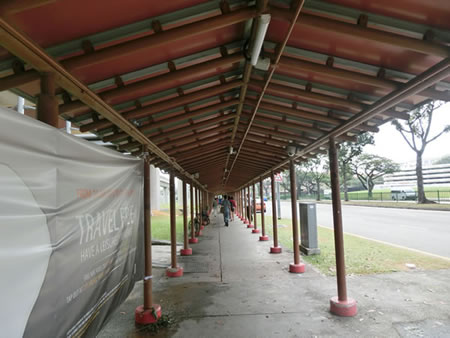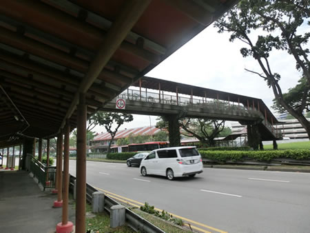 ■突発的な雨が多いシンガポール、または日差し除けの意味もあると思いますが、シンガポールの駅からの歩道はこのように屋根付きで仮に雨の時間帯でもある程度のところまで傘を差さずに行けるようになっているところが多いです。スタジアムは道路を挟んで右に渡る必要があります。信号がないため、歩道橋がある位置までこの道を進んでいきます。