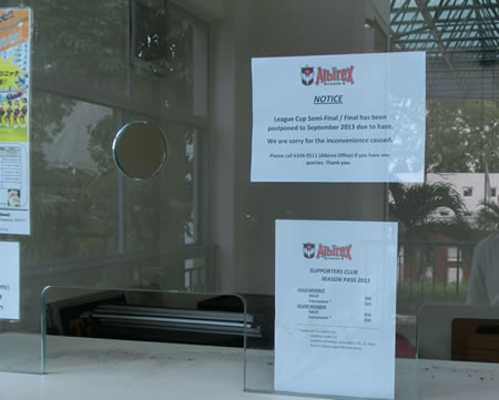 ■チケットブースに貼ってある注意書きの一つには、ヘイズ(煙害)の影響でカップ戦準決勝、決勝が延期になったと書いてありました。ちょうど、訪問時は、ヘイズの被害が騒がれていたころです(ただし、この日は、長い時間雨が降っていたためか、空気の悪さはほとんど感じられませんでした。)