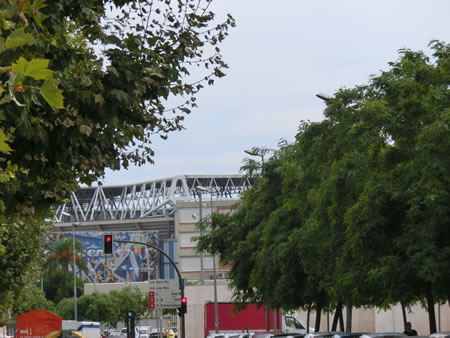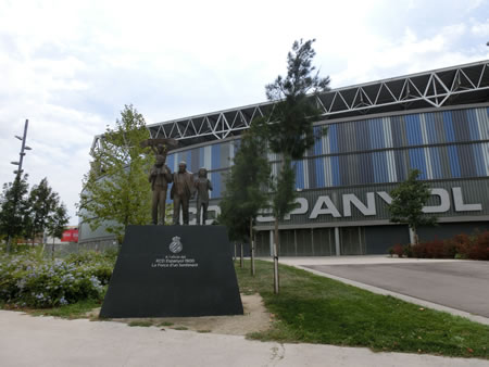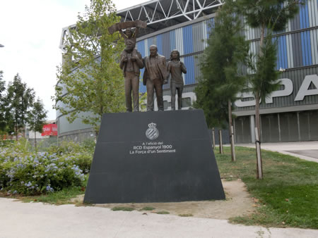 ■スタジアム正面にサポーター家族を模したと思われる銅像があるのですが、この銅像にRCD ESPANYOLのスタジアムの文字を背景にして写真を撮ろうとすると、どうしても数本の高めの気が邪魔するんですね、残念。