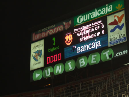 | 前日のトマト祭りは飛行機の関係で参加できず、ヴァレンシアの試合だけは見てやろうと言うことでメスタージャへ足を運びました。今年から大会名がUEFAカップからUEFAヨーロッパリーグに代わり、そのプレイオフラウンドの第2戦のスタベイク戦です。スタベイクと言えば小林大悟選手が所属しているチームですね。いい動きしてましたが、試合自体は第1戦のスタベイクのホームで3-0でヴァレンシアが勝利しているため、この第2戦はある意味消化試合となっていました。試合開始直前まで多くのファンはスタジアムに入らず外でダラダラしてましたw