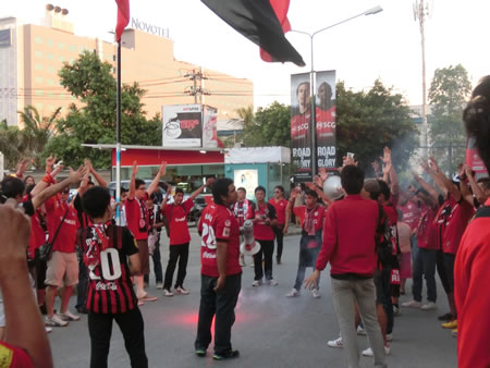 | 2013年5月1日に行われた、ACLの試合を観戦しました。この試合目的で訪れた浦和のサポーターの方の中には、LCCのエアアジアがこのスタジアムから2キロくらいのドンムアン空港を使用するということで、こちらを利用していた方も多かったですね。バンコク市内からのアクセスになる場合は、距離としては30キロくらいになりますので、スムーズに動けば30分程度で着きますが、バンコク市内でも渋滞ポイントが多くありますので、そこではまると結構時間がかかることもあります。また、バンコクでは普通ということなのですが、車で移動の場合は、タイの王族の車が走る場合に警察が規制をしいてしばらく一般車は走れなくなるということもあります。まさに、今回その規制に動けない時間がありましたが、幸い10分ほどで動いたので問題ありませんでした。