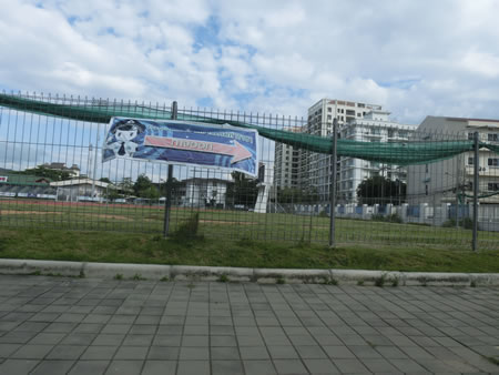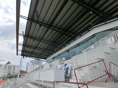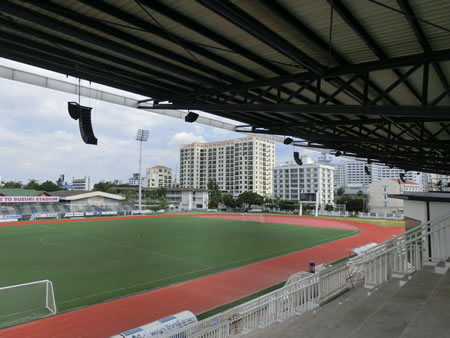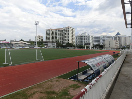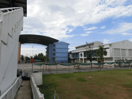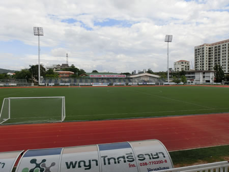 | 2013年11月にスタジアム訪問しました。シーラチャーは、日本企業が多く、日本人も多いそうです。スタジアム周辺には、ロビンソンデパートがあり、ここで大体の買い物ができるとか。いわゆる、そういう街を本拠地に持つクラブチームがシーラチャFCということですし、読んで字のごとく、スタジアムにはSUZUKIの名前も入っていますし、日本とは縁が深いようです。シーズンオフということで、試合で足を運んでいないため、雰囲気は掴むことはできませんでしたが、学校と同じ敷地内にスタジアムが存在するという不思議な立地でした。着いたときは、敷地の入口がすべてしまっており、外から写真を撮ることになるかと思いきや、もう一周した時に、ちょうど門が空いたようで、敷地内に入ることができました。スタジアムも空いており、入口に警備員がいたものの、写真を撮りたいと頼むと快く中へ入れてくれました。ちょうど、到着した時間帯が学校終了の時間らしく、小学生くらいの子供たちがワイワイしていました(この時間の関係で、敷地の門が開いたのかもしれません、よくわかりませんがw)