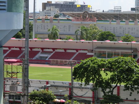 ■最寄り駅のサナームキラーヘンチャート駅からの風景。目の前の内部が見えているのは、国立競技場ではなく、隣接するテパサディン・スタジアム(Thephasadin Stadium)で、その奥に見えるのが、国立競技場になります。