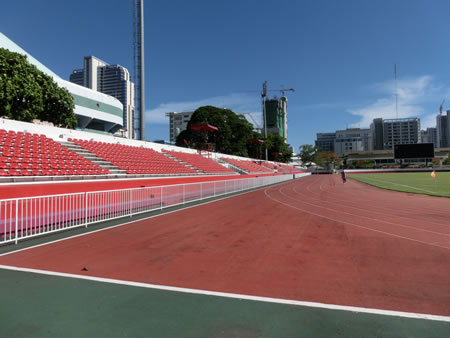 | 2013年の浦和レッズのACLを観戦するために、タイのバンコクを訪問し、4月30日にスタジアムを訪問しました。とは言え、隣接するテパサディン・スタジアムの内部の写真は撮れたものの、肝心な国立競技場の内部の写真は撮れていません。 バンコクにあるスタジアムの中では珍しく、駅からのアクセスが最高の立地で、国立競技場駅の目の前がすぐ敷地になっています。主にスパチャラサイ国立競技場は、タイ代表の試合で使用されるとのことですね。隣のテパサディン・スタジアムは、テロ・ササーナのホーム(メインの本拠地ではない模様)として使用されることもありつつ、過去U18日本代表などユースカテゴリの大会で使用されたこともあります。 基本的に、アジアレベルの大会で良く使用されるスタジアムですね。 | |