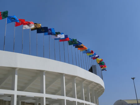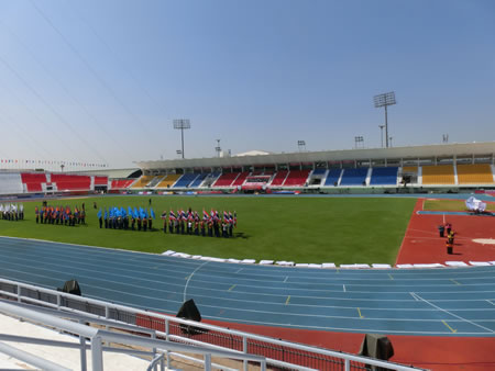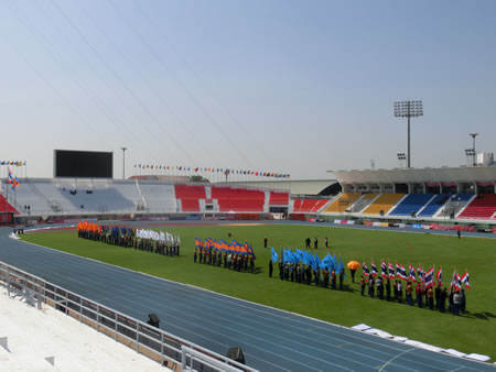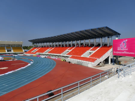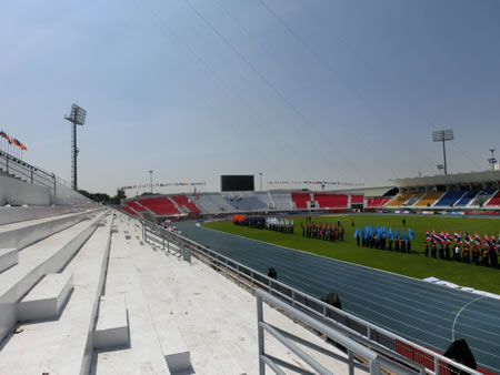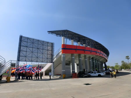 ちょうど、この日1月13日は、バンコクの大規模デモによる道路封鎖などが始まった日で、道が封鎖されたらたまらないということで、急いでスパンブリーへ移動しました。道自体は、途中までは高速道路で、あとは、バンコクからスパンブリーにつながる340号線を車で走り続ける感じでした。 街の中心部の道路周辺は、思ったよりも整備されていました。そして、スタジアムは、なかなかこれまた綺麗です。座席もカラフルな色分けになっていたり。 オフシーズンで試合は行われていなかったものの、何かよくわかりませんが行われており、子供がたくさんいました。旗を持って歩いていたり、なんだったのでしょう。そのおかげか、スタジアムも完全開放だったので助かりましたが。 | |