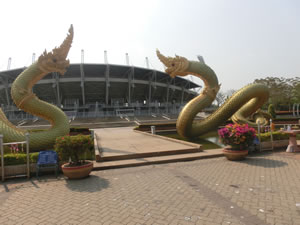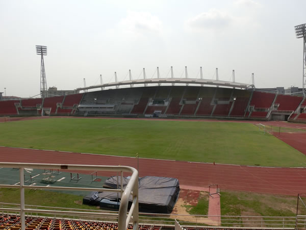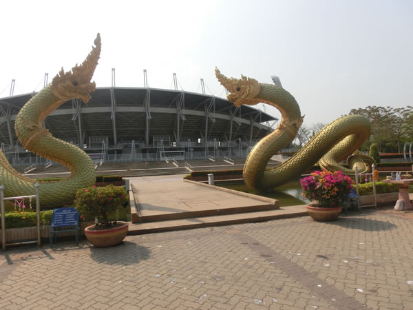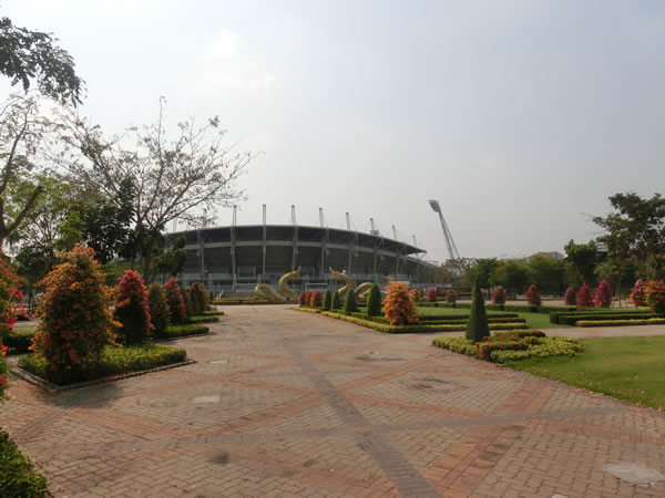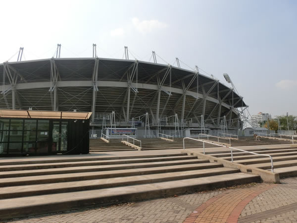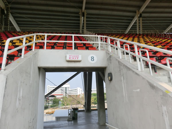 | スタジアムまでの道のり | ワットポーの近くにある、タンマサート大学とは別のランシットにあるタンマサート大学ランシット校の中にあるスタジアムになります。鉄道でのアクセスが推奨されるかは、微妙ですが、タイ国鉄北線で1~2時間に1本ほど出ており、バンコクからは1時間程度、ドンムアン空港駅からは15分~20分程度で駅に着きます。比較的、わかりやすい場所にあるのですが、渋滞しやすいドンムアン空港周辺を通るため、バンコクからの車でのアクセスの場合は、それなりに渋滞も考慮に入れて動いた方が良いと思われます。参考まで、今回、バンコクのMBKセンターからタクシーを利用しましたが、メーター利用で、400バーツ近くかかりました(高速を使う場合は、高速料金もかかります。)距離にして40キロくらい。所要時間は1時間程度。ランシットにあるタンマサート大学と言えば、大まかな場所は、タクシーの運転手の方にも伝わりやすいですが、基本的に遠くまで行きたがらないタクシーの運転手が多いので、行先を伝えて行ってくれるタクシーを探してくれる(?)MBKセンターのタクシー乗り場など利用すると、少し良いかも。 |
