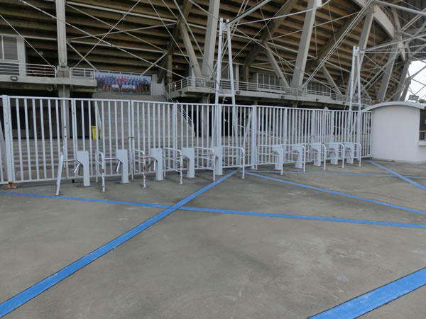 ■結果的に、スタジアムに行く場合の駐車場は、プールの横が最も近いところのようで、ここから歩くことに。プールから数分歩いたところにサッカースタジアムがあります。上記の写真ですと、左にプールがあり、前方にサッカースタジアムが出てきます。