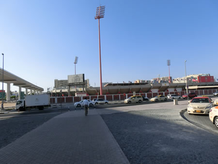 2013年のU17ワールドカップの開催地にも指定されているスタジアムですが、試合日には足を運びませんでしたので会場内の試合時の雰囲気などの写真はありません。 5年前に、ドバイに来た際にタクシー運転手に、このスタジアムにも行ってほしい旨伝えたのですが、ここだけがわからず訪れることができなかったので、やっとこさ5年越しで訪問できたスタジアムになります。 2009年にドバイメトロが開通し、おそらく現時点で最もアクセスしやすいスタジアムと言えると思います。何しろ駅名がスタジアムですから。ちなみに、ガイドブックや、電車内などの表記ではStadiumのみの表記になっていますが、駅自体には、Al Ahli Stadiumという表記になっています。ページによっては、ラーシド・スタジアム駅など様々です。 駅を出ると、すぐにスタジアムの景色が目に入ります。また、駅の横にはショッピングモールもあるので、試合などで訪れた際には、試合までの時間つぶしにも、それほど困らないと思います(中には入っていないので、どのような店が入っているのかはわかりません。) | |