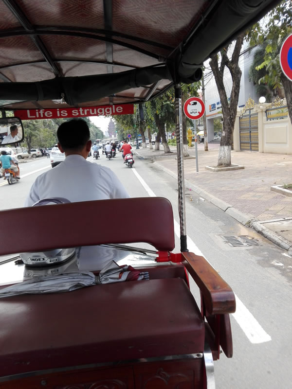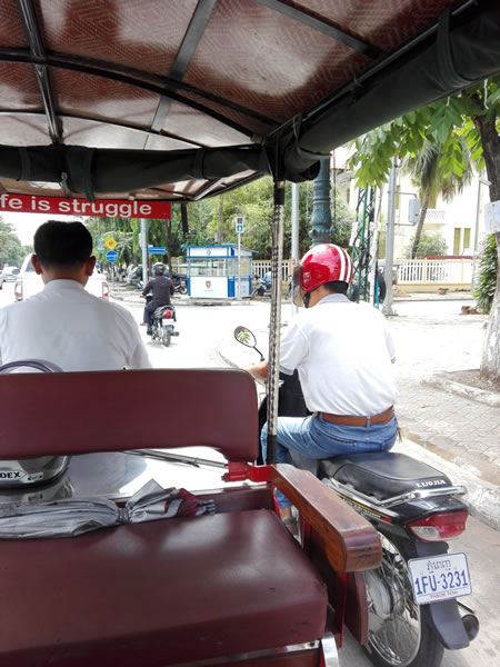 ちなみに、この通りは、ノロドム通りという、かなり大きな道になります。私がいつも使うトゥクトゥクドライバーのトゥクトゥクより撮影しています。奥のほうに独立記念塔も見えますね。