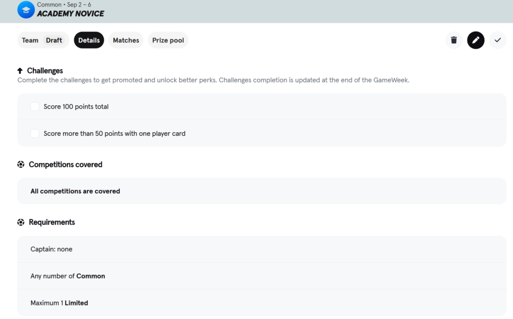 このコンペでは、最下段に書いてあるようにリミテッドカードのみが使用できます。さらに、キャプテンの指定(後述)はなし、同じチームの選手は2名まで使用可、そのほか直近の成績でも使用できるカードが限定されています。