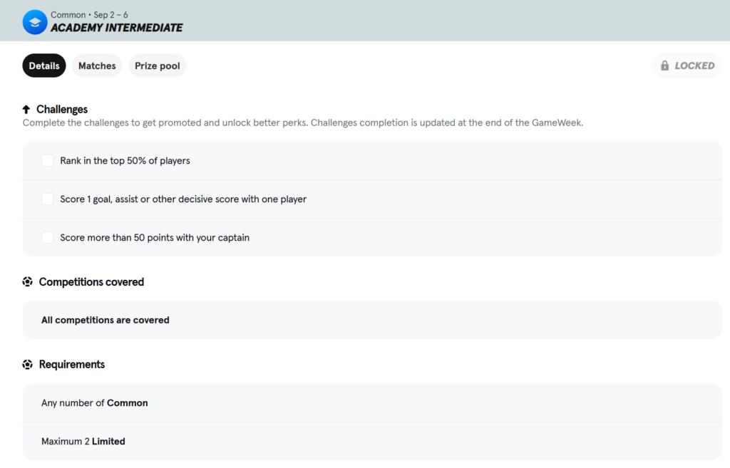 各コンペをクリックすると、使用できるカードの条件、対象の試合、報酬を確認できます。
