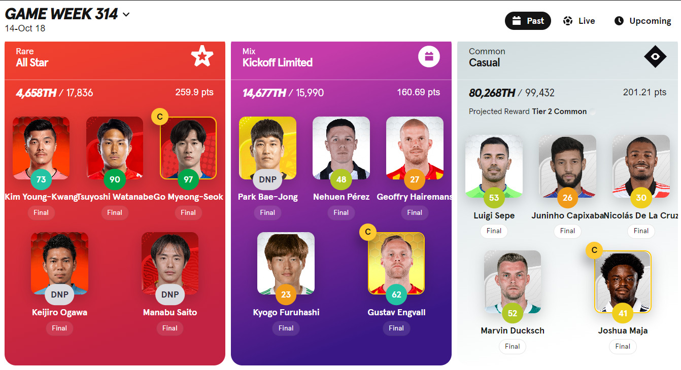 蓋を開けてみれば、この2選手が出場なしという結果に終わっただけでなく、ベンチ外になったことで、スタメン発表を見た段階で、ほぼほぼ諦める状況になっていたのですが、他の3選手が想像以上のスコアをたたき出してくれて、250ポイント越えを達成することになりました。