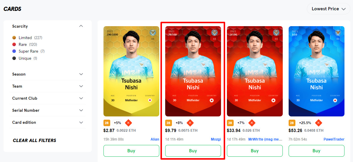 来季もそのまま2部リーグでプレーしたり、Sorareが対象としていないヨーロッパのチームへの移籍の可能性もゼロではありません。しかし、この価格であれば、獲得しても良さそうなところまできていましたので購入しました。