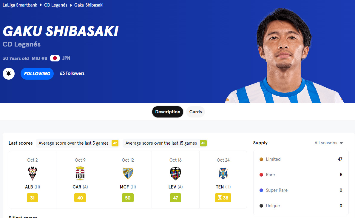 sorareがスタートした2019年には3部のデポルティヴォ・ラ・コルーニャに所属しており、その後は、この2部のレガネスに所属していたということで、柴崎岳選手のカードは、2022-2023シーズンまで発行されたことがなく、ここ最近、カード発行がされ始めています。