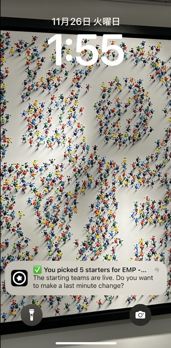 スマホの設定でsorareアプリの通知を許可しておけば、先発発表時や対象試合開始や経過などを通知で教えてくれます。