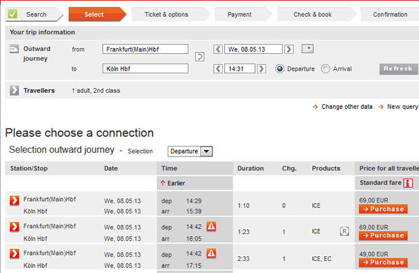 所要時間は1時間~2時間くらいですね。乗り換えを含めての移動であれば50ユーロ程度。私は、49ユーロのコースで移動したため、その時のレートで6000円くらいでフランクフルトからケルンまで移動しました。