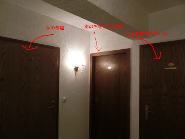 これが驚きのポイントです。一部の部屋がなのですが、廊下に部屋の扉とトイレの扉があります。要するに部屋にトイレがないんですね。大半の部屋にはあります。そして、そのトイレが共同ならまだありえるのですが、専用トイレなんですね。要するに、自分の部屋の鍵でしか開きません。ただ、腹が痛くなって、急いでトイレに行きたい時は、部屋を出て、部屋の鍵を閉めて、トイレの鍵を開けてという作業があるため、結構焦りますw