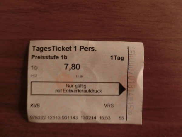 窓口があれば良いな~と思ったものの、この駅には窓口がない。券売機も、小銭のみのタイプだったと思います。ケルン中央駅に行けば窓口はあるのは確実でしたが、やまをはってこの駅に入ったものの空振り。1駅だから、無賃乗車しちゃっても結果的に1日券買うんだから良いやと頭をよぎったものの、それはまずいだろうということで、いったん駅を出て、ケルン中央駅まで歩き、地下にあるドム駅の窓口でようやく1日券を購入して動き出したわけです。