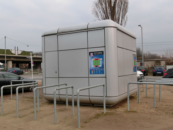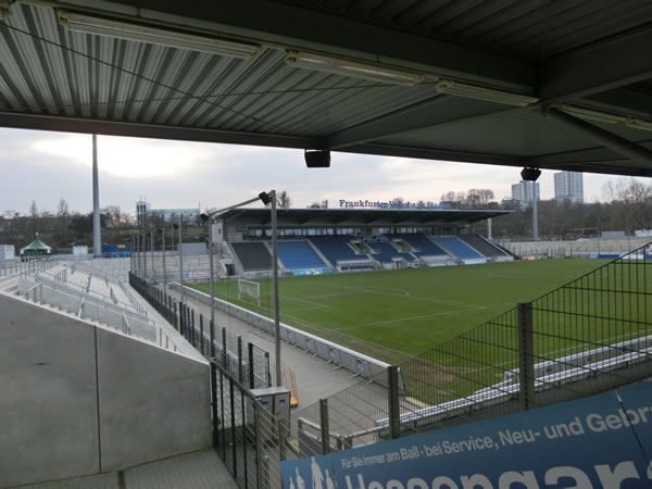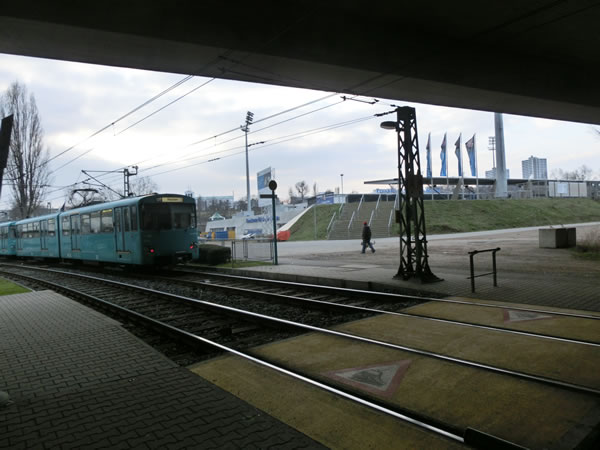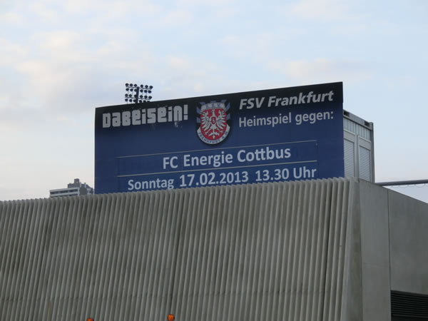 2月13日、3つ目のスタジアム訪問は、FSVフランクフルトのホームスタジアム、フランクフルター・フォルクスバンク・シュタディオンになります。この前のマインツ05の本拠地訪問で気が付けば2時間くらい歩き回っていた計算となり、足の裏が尋常じゃなく痛くなってたりしましたが、今回は徒歩で歩く距離は、ほとんどなしの最高の立地条件のスタジアムです。