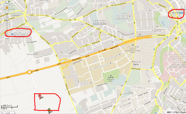 地図上の右上がマインツ中央駅、左が最寄駅(でも電車の本数が劇的に少ない)のマインツ・ゴンゼンハイム駅、下にあるのが、マインツの本拠地となるコファス・アレーナになります。マインツ中央駅からだと、4キロ以上あるので歩くと1時間くらいかかってしまいますね。