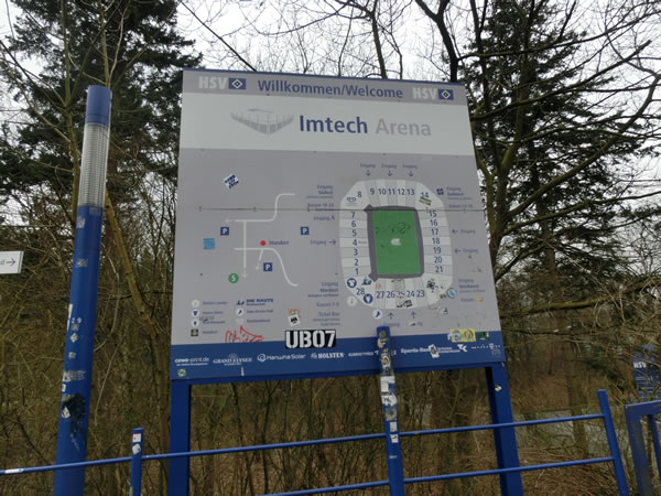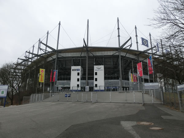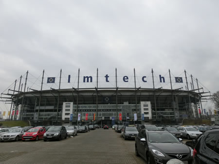 ハンブルクで最初に訪問したスタジアムは、セオリー通りのハンブルガーSVのホームスタジアム、イムテック・アレーナになります。ちょうど、ハンブルガーSVの試合が2月16日にあったので、特に何もなく静かな訪問になると思っていたのですが、何かイベントごとなどがあるようで、上記のようにスタジアムには結構な数の車が停まっていたり、駅から試合さながらの恰好をしてスタジアム方面に歩くファンらしき姿、駅の近くのオープンバーらしきところでは、酒飲んでいる厳つい兄さんがいたりしました。