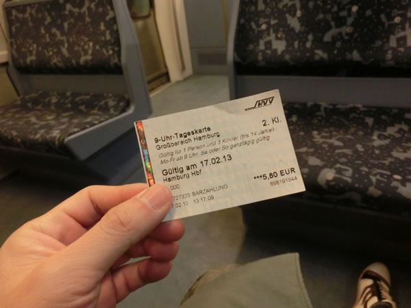 ハンブルクに関しては、観光地としても有名なので事前に1日乗車券の情報はつかめていており、利用可能エリアも含めてOKでした。9時からの市内の1日乗車券、5.8ユーロです。