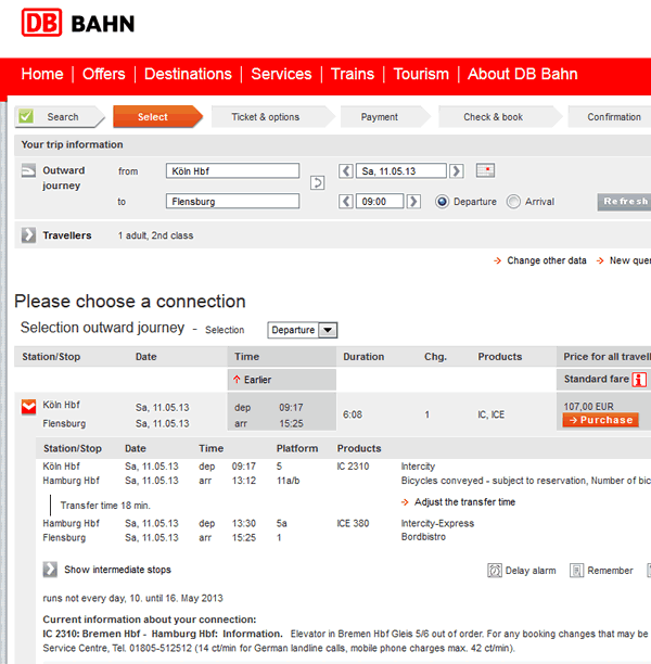 電車が遅れて、乗り換え駅のハンブルクに到着したのが、出発時間を過ぎていたんですね。天候云々ではなく、電車が遅れることは良くあり、こういう長距離での乗り換えはあまり推奨されていないんですね。もちろん、保証もしてくれません。