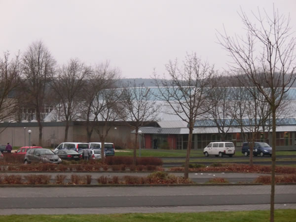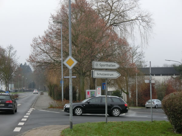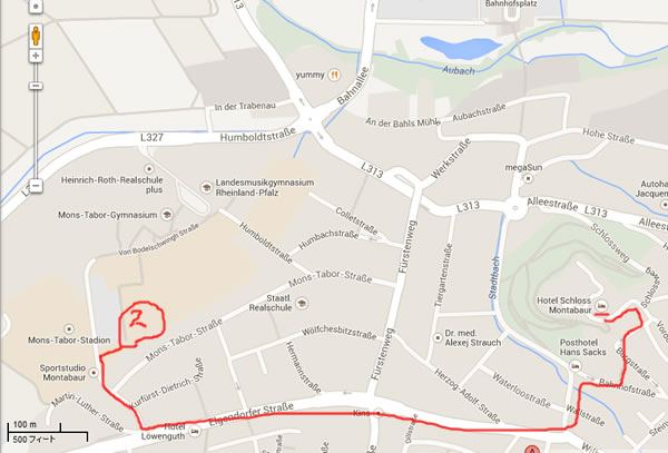 右側のホテルの裏側から下って行くと、Bahnhofstrasseという通りに出ます。この通りに出るまでの下りの傾斜度が凄いですが、ここを降りてしまえば、割と平坦な道になります。あとは、地図の赤線のようにElgendorfer Strasseに出てしまえば、この道(ここも上り坂があります)を進んでいき、右折して少し行けば会場です。隣に、Mons-Tabor Stadionというスタジアムがあります。以前は、ドイツの下部リーグの本拠地として使われていたようですが、今は、もしかすると育成系のみでしか使われていないかもしれません。