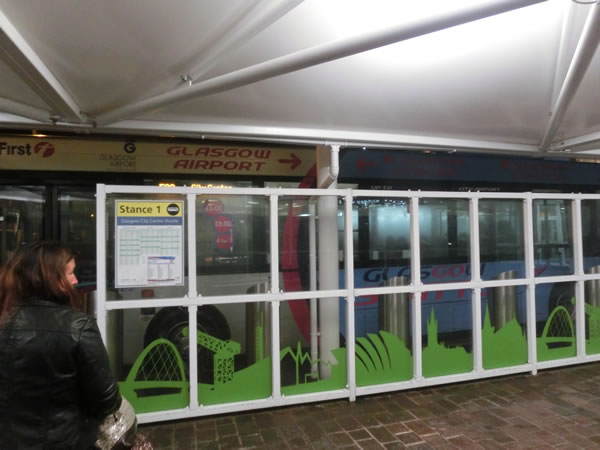グラスゴー空港へ到着し、滞在するホテルに近いグラスゴーセントラル駅へバスで出る流れで考えており、バス乗り場は上記のようにすぐに見つかりました。