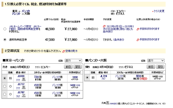 で、色々調べていたら、特典航空券で帰国便のビジネスクラスでのバンコク-関西空港の便に1つ枠が空いていて、それを利用すれば14日の夜遅めの便で15日の朝に関西空港につけるんですね。
