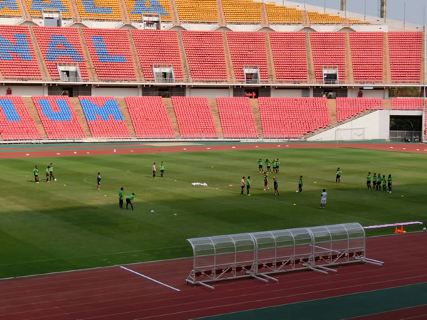 見事なスタジアムです、巨大です。そして、タイ代表と思われる人たちが練習していました。プレスも入っていたのでたぶんそうです。