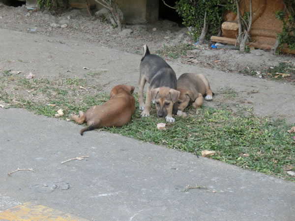スタジアムの敷地の入口の横くらいの建物に子犬3匹。
